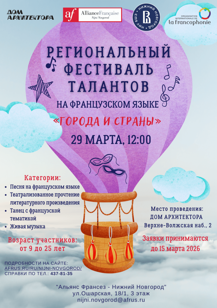 Фестиваль проводится совместно с НИУ ВШЭ в Нижнем Новгороде в рамках Дней Франкофонии – 2026.
